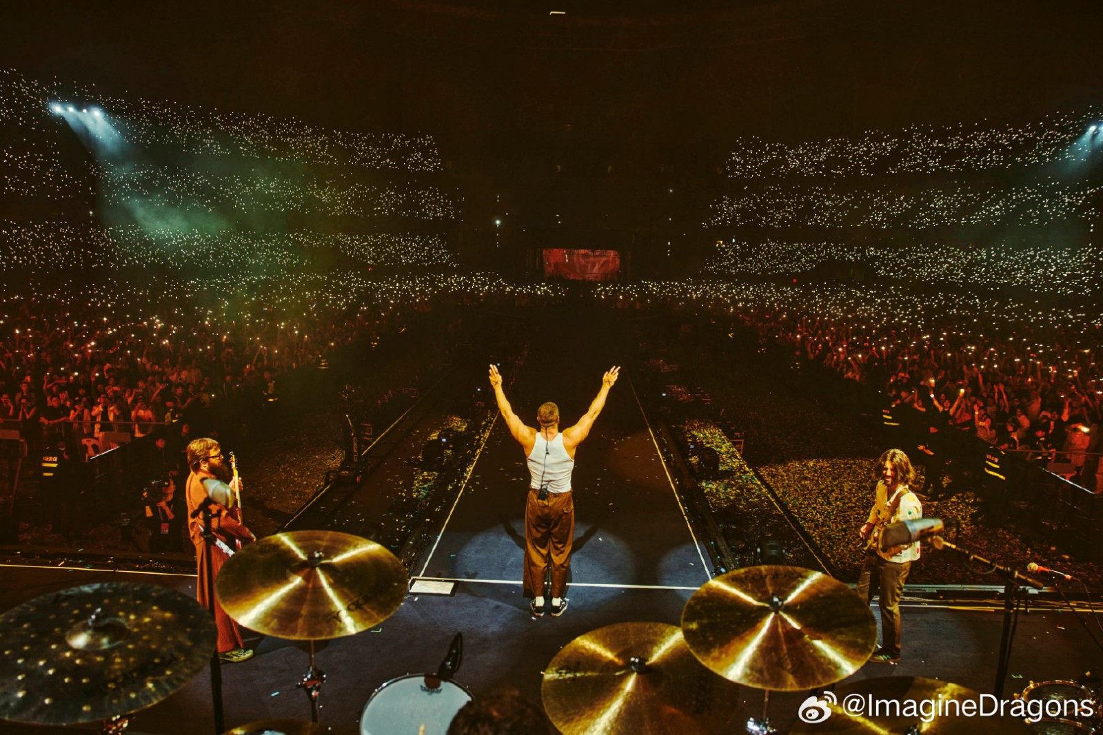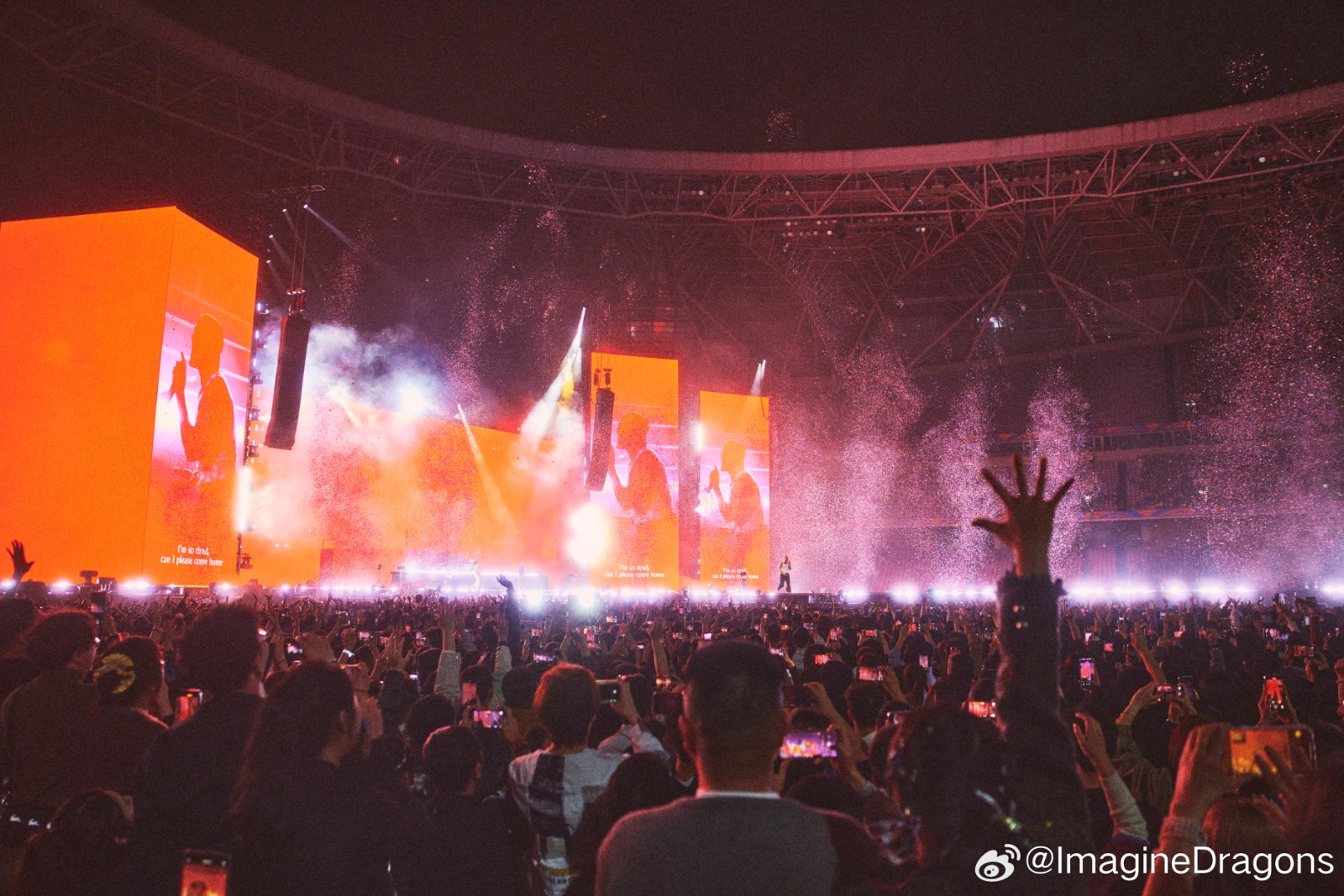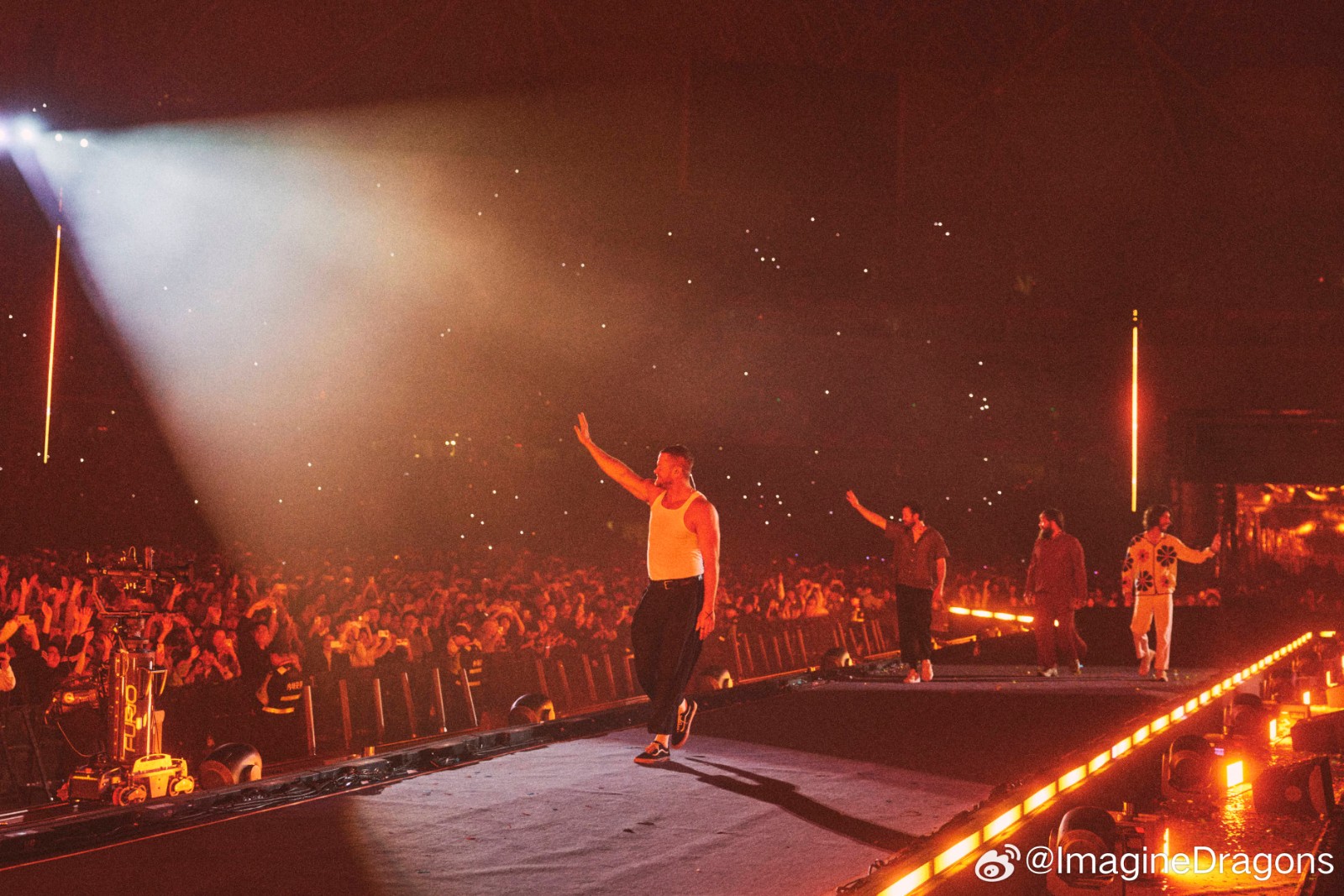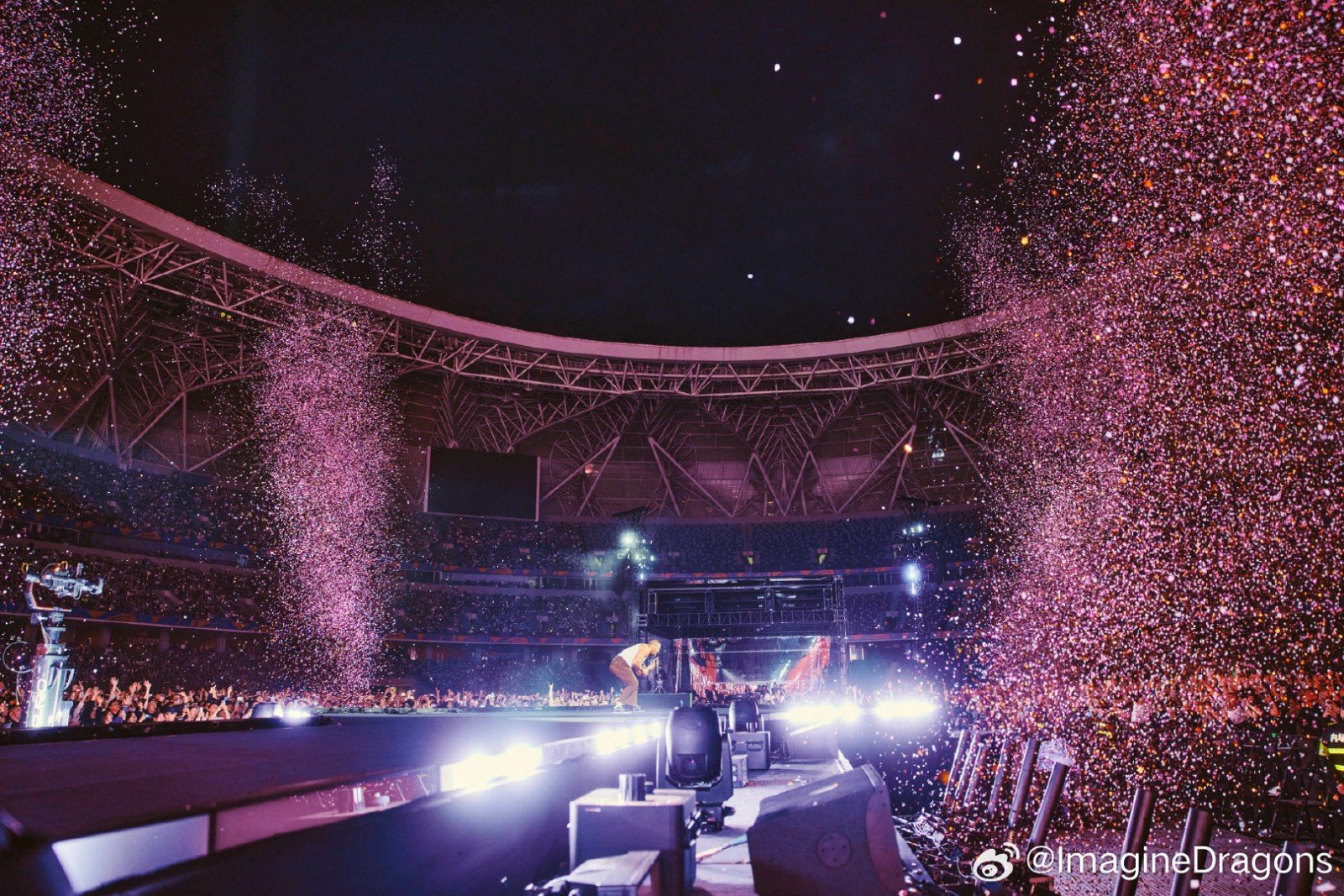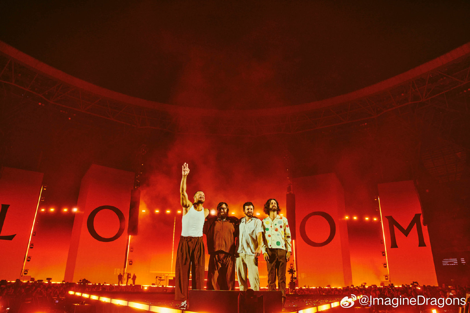 On April 4 and 6, 2025, world-renowned American rock band Imagine Dragons launched the China leg of their LOOM World Tour with two spectacular shows at the Hangzhou Olympic Sports Center Stadium (“Big Lotus”). As the official lighting equipment supplier for the event, Anmingli Stage Lighting (AML Lighting) proudly provided our flagship product — the MH1960IP 19×60W Outdoor Waterproof Bee-Eye Wash Moving Head — delivering an unforgettable visual experience to tens of thousands of fans.