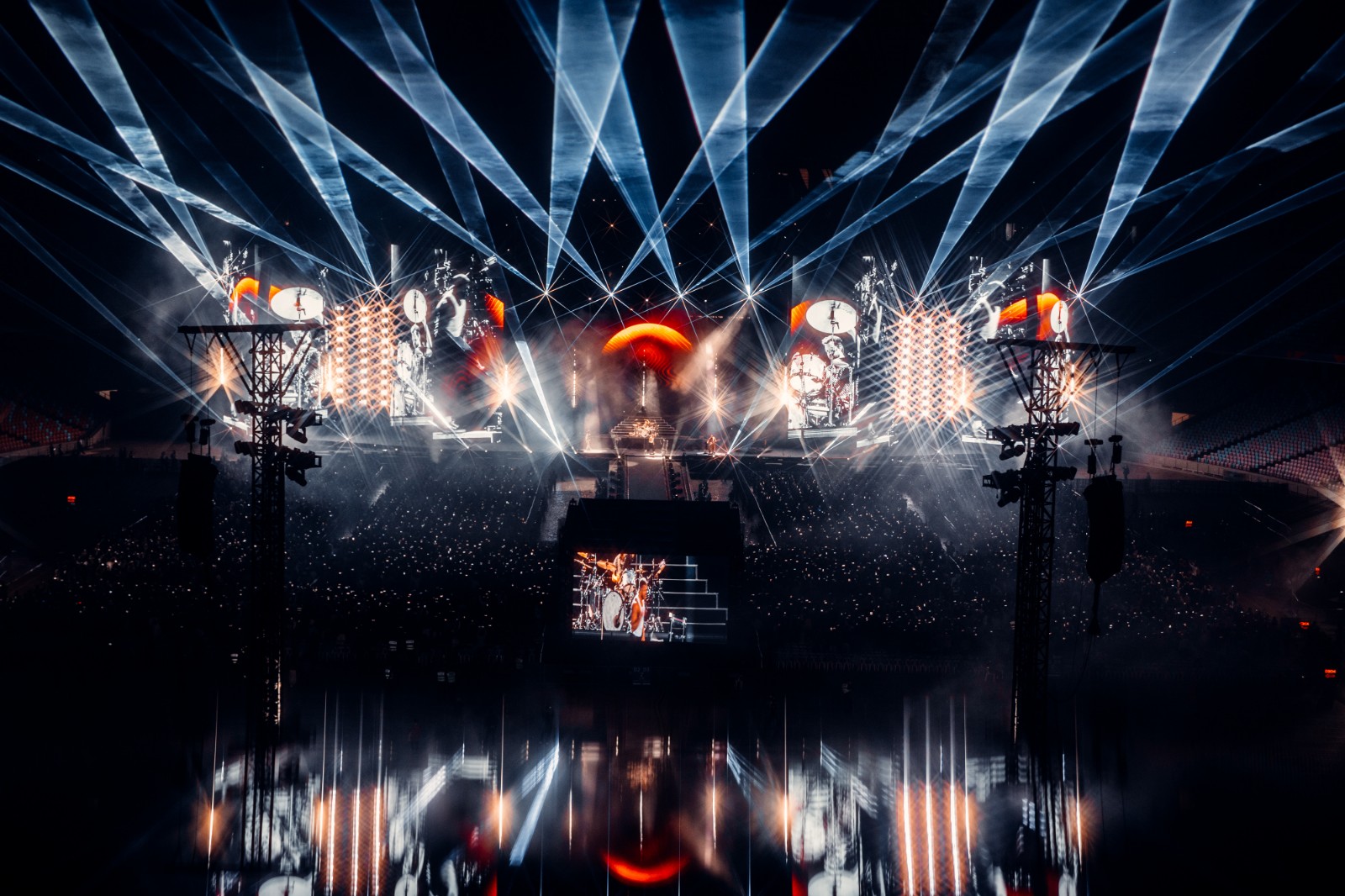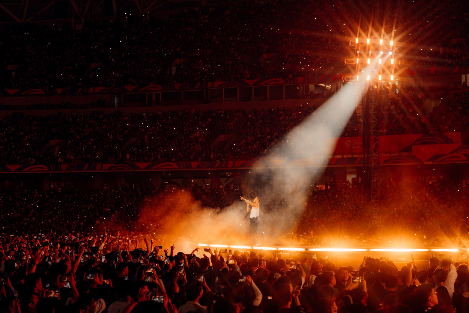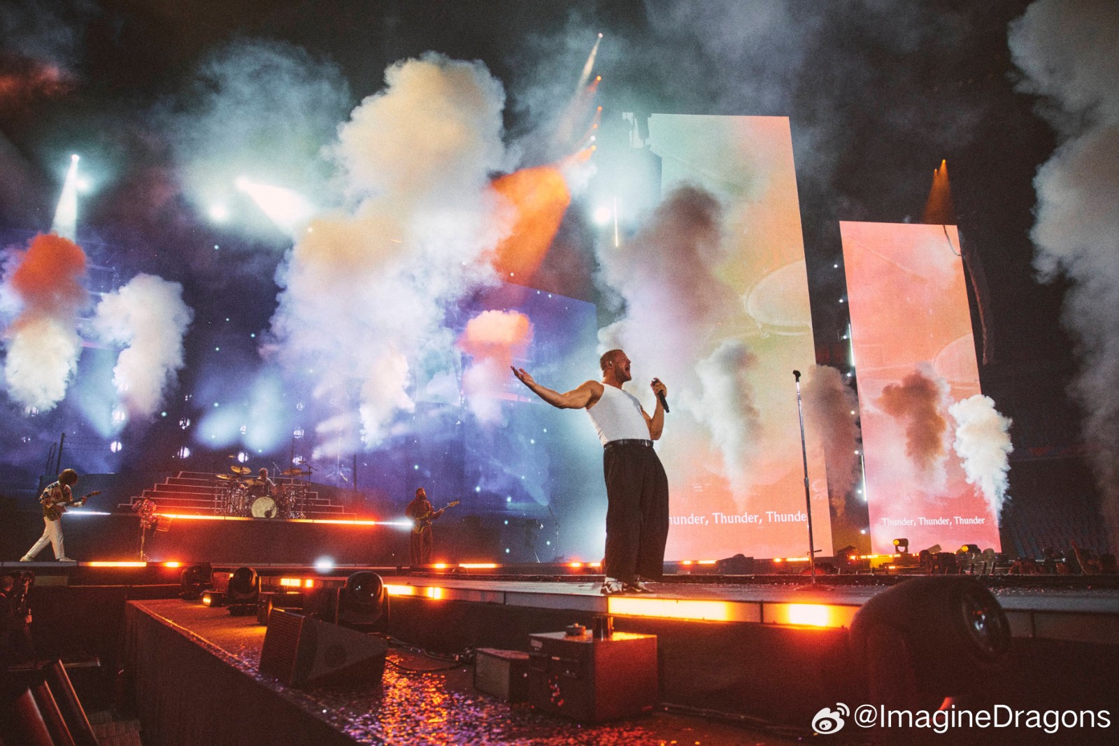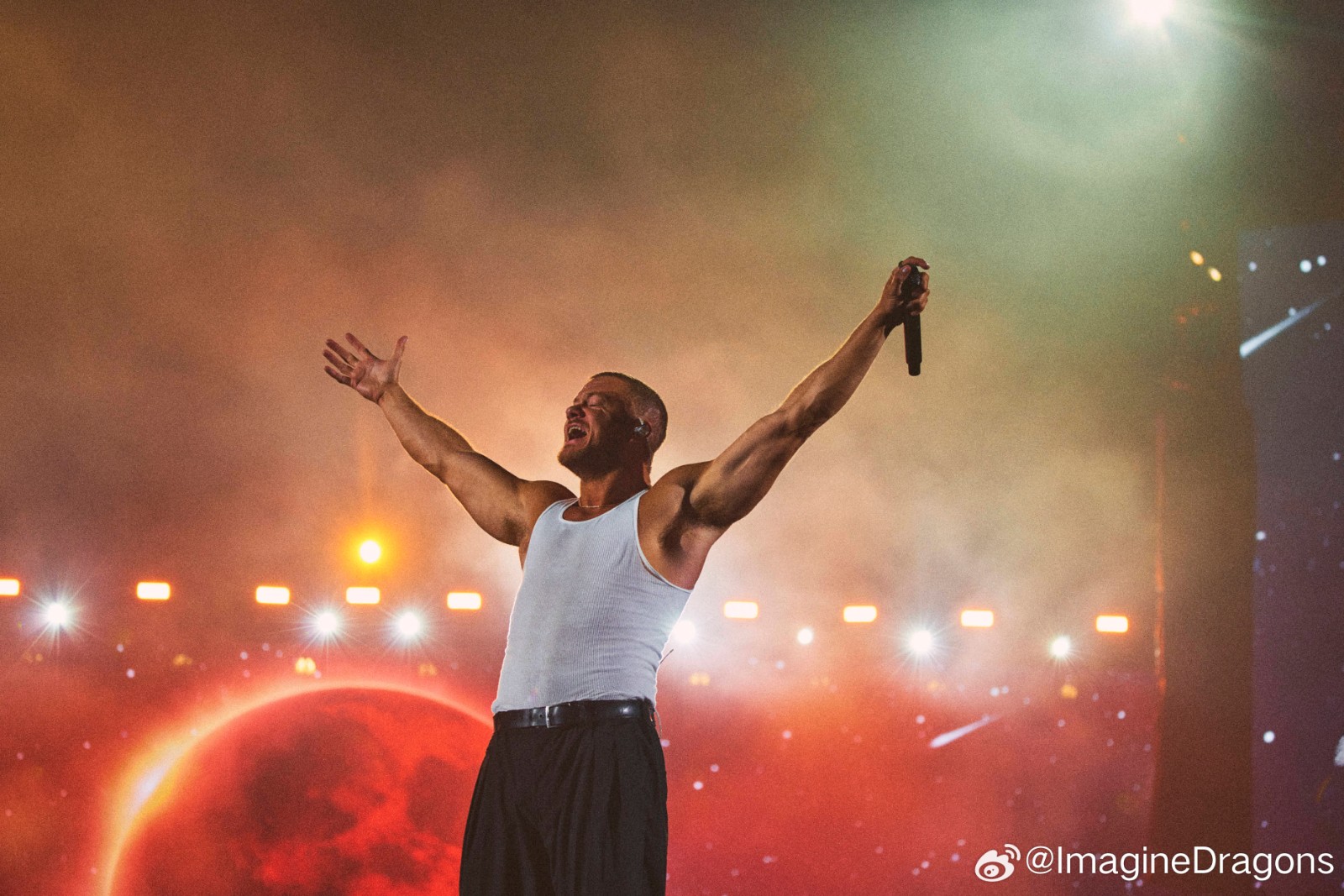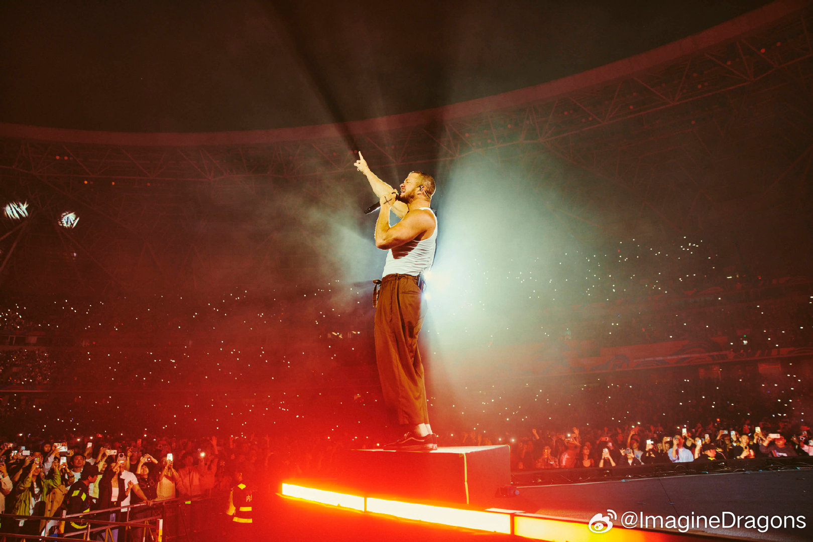 On April 4 and 6, 2025, world-renowned American rock band Imagine Dragons launched the China leg of their LOOM World Tour with two spectacular shows at the Hangzhou Olympic Sports Center Stadium (“Big Lotus”). As the official lighting equipment supplier for the event, Anmingli Stage Lighting (AML Lighting) proudly provided our flagship product — the MH1960IP 19×60W Outdoor Waterproof Bee-Eye Wash Moving Head — delivering an unforgettable visual experience to tens of thousands of fans.