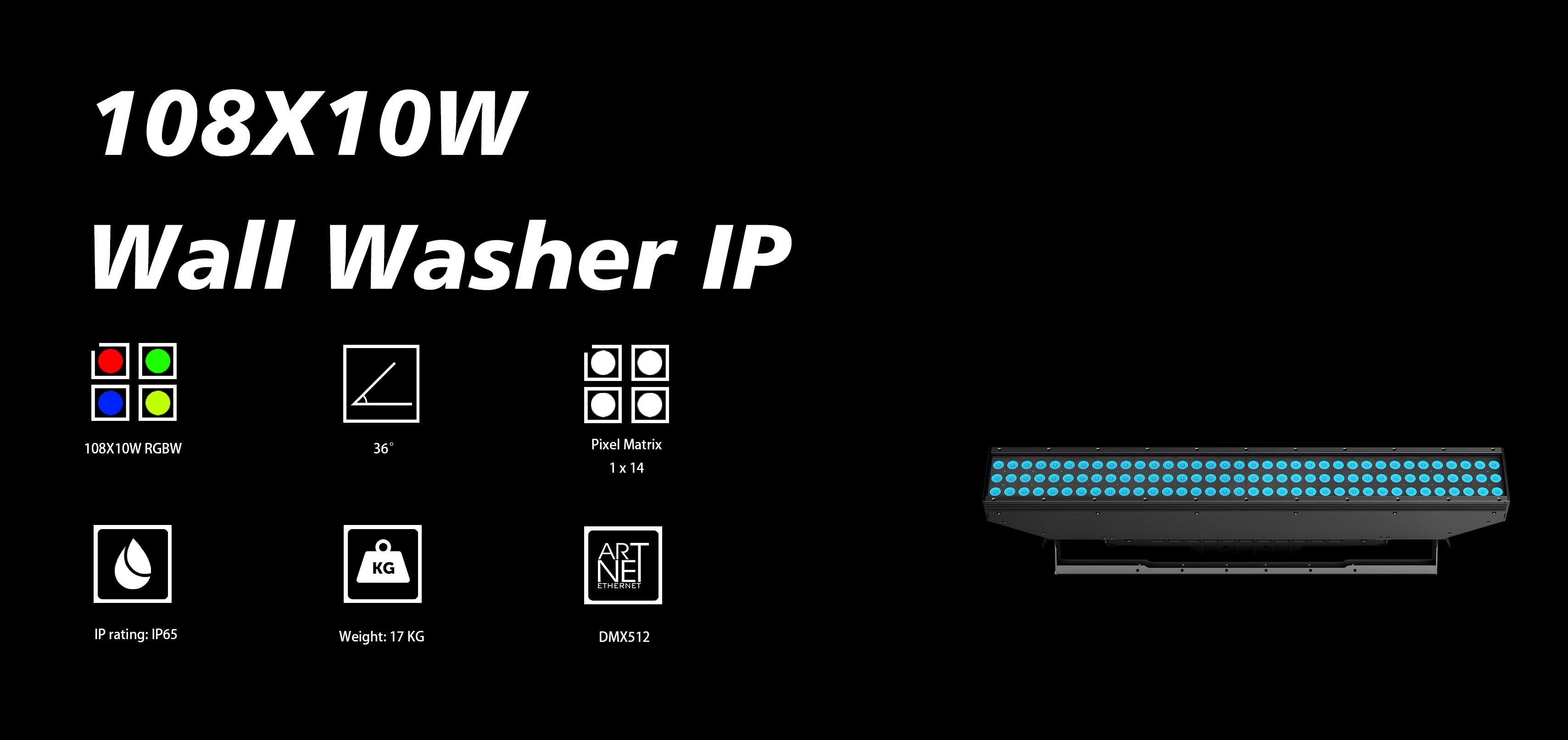 LEDs:108*10W RGBW LEDs divided into 12 pixels